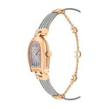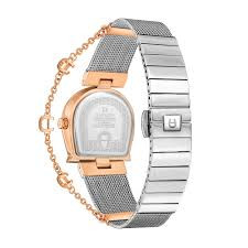 horseshoe-shaped case. A matching dual-tone SS/RG mesh bracelet wraps the wrist