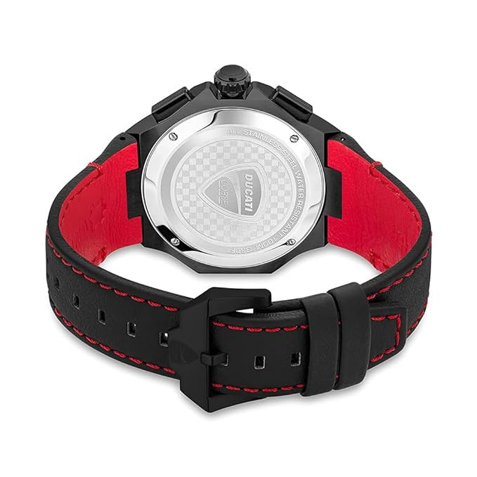 and red stainless steel case, sleek black dial, and matching black-red leather