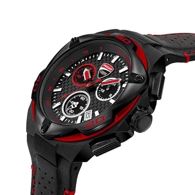 with vibrant red highlights, encasing a crisp black dial with luminous markers