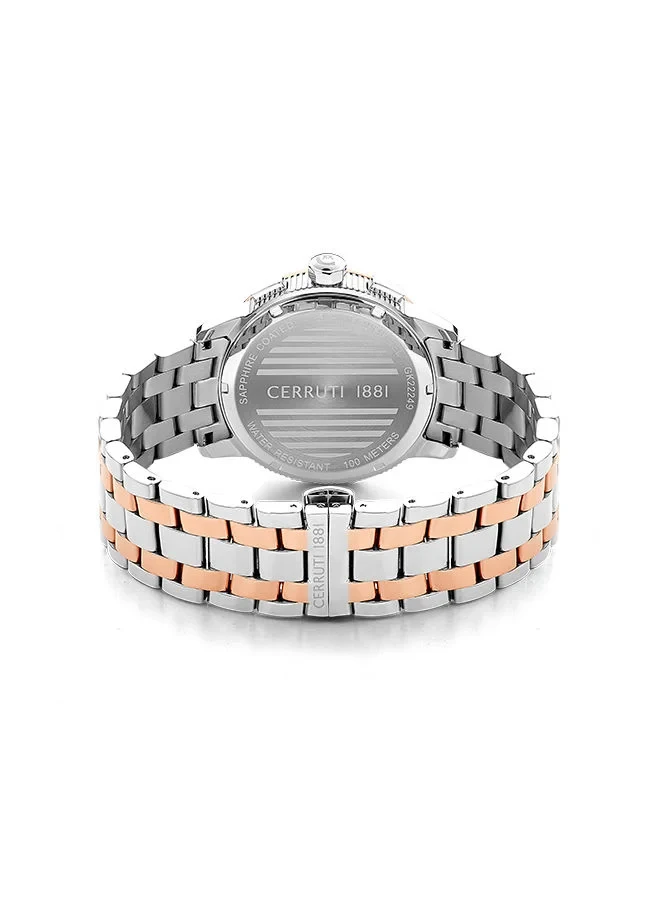 of stainless steel and rose gold tones. Its deep green dial and two-tone