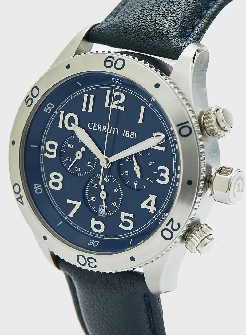 with business and smart-casual outfits. The dark blue leather strap deepens the