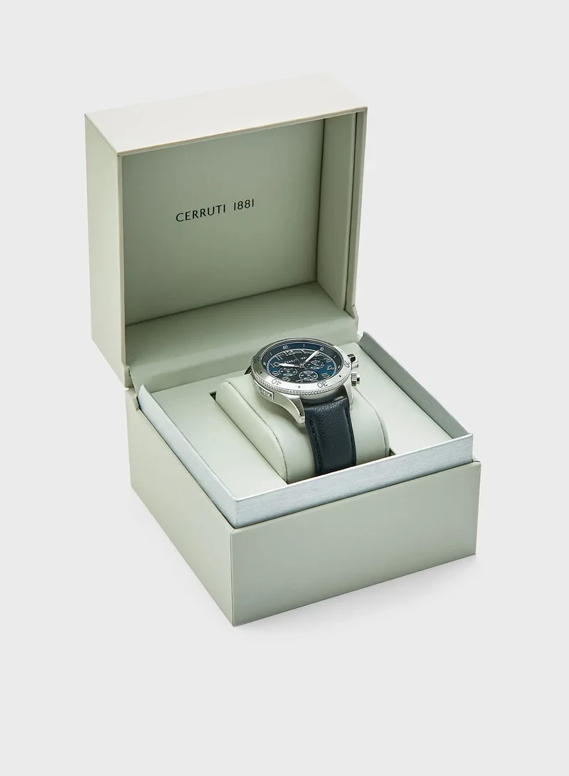 dial, and dark blue leather strap. This configuration creates a cohesive,