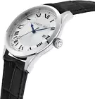 stainless-steel case with a crisp white dial and a black leather strap for a