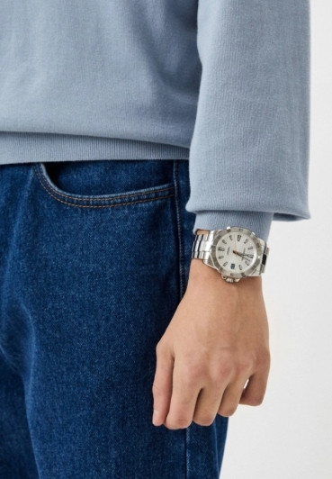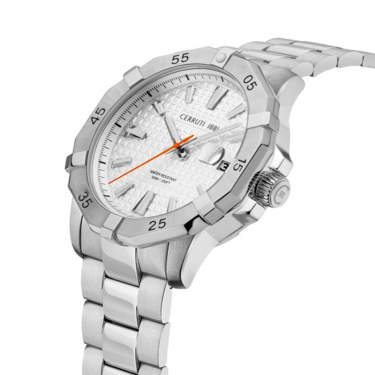 silver stainless steel case and bracelet and a crisp white dial. Crafted for