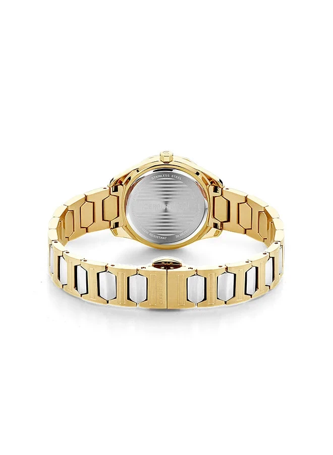 beautifully crafted case and bracelet blend gold-plated and stainless steel