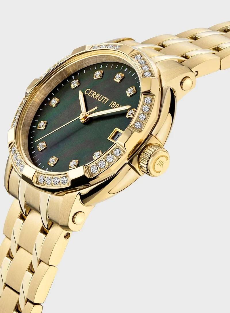 MOP women’s watch. This glamorous timepiece features a gold-plated round case,