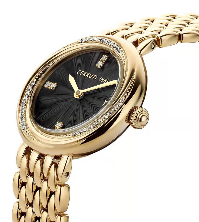 high-contrast glamour with gold-tone hands and minimalist markers, elevated by