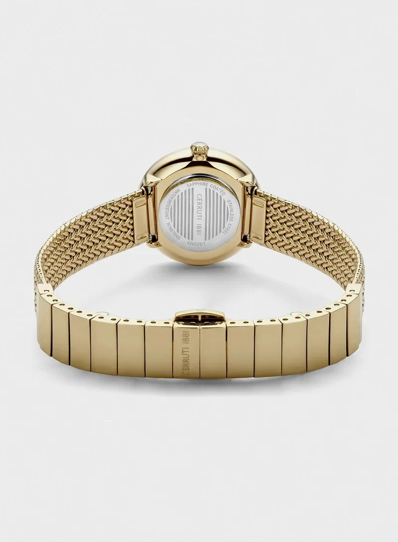 lovers. Its gold-plated stainless steel 26mm round case and mesh or link