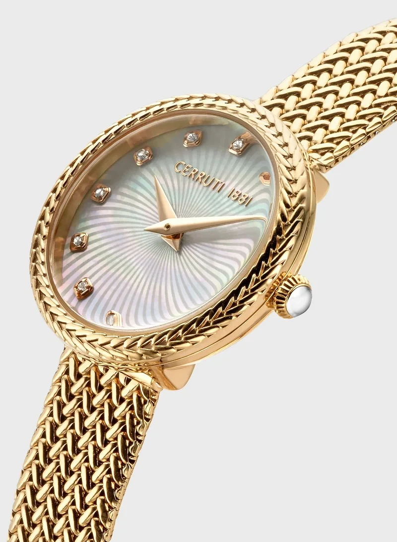 opalescent shimmer and elegance. Minimalist markers and gold hands ensure clear
