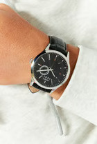the black leather strap so the watch sits comfortably on your non‑dominant