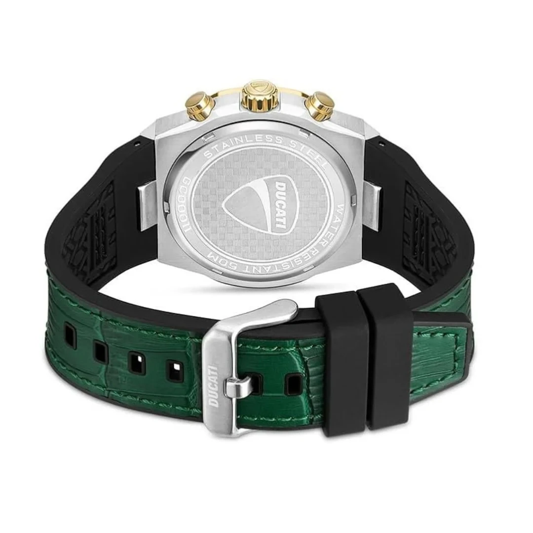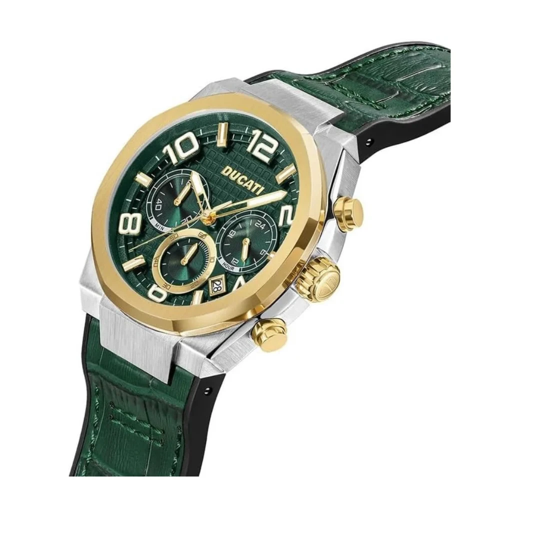 The DUCATI DT006 GREEN DIAL GOLD CASE GREEN STRAP is a bold men's chronograph