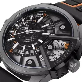 an edgy, industrial look, while the dual-tone black and grey dial delivers
