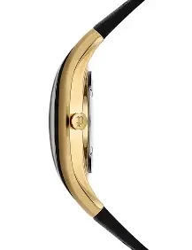 ion-plated gold-tone (IPG) case, bold black dial, and matching black strap.