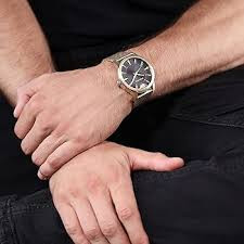 The IPG CASE, BLACK DIAL, IPG MESH BAND is a luxury men’s wristwatch featuring a gold-toned ion-plated (IPG) case and matching mesh band, paired with a striking black dial. It’s designed for those who appreciate modern elegance, lasting durability, and a distinctive, contemporary accessory for all occasions.