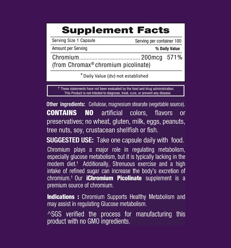 Iremedies Chromium Pico 100s is a dietary supplement that supports healthy