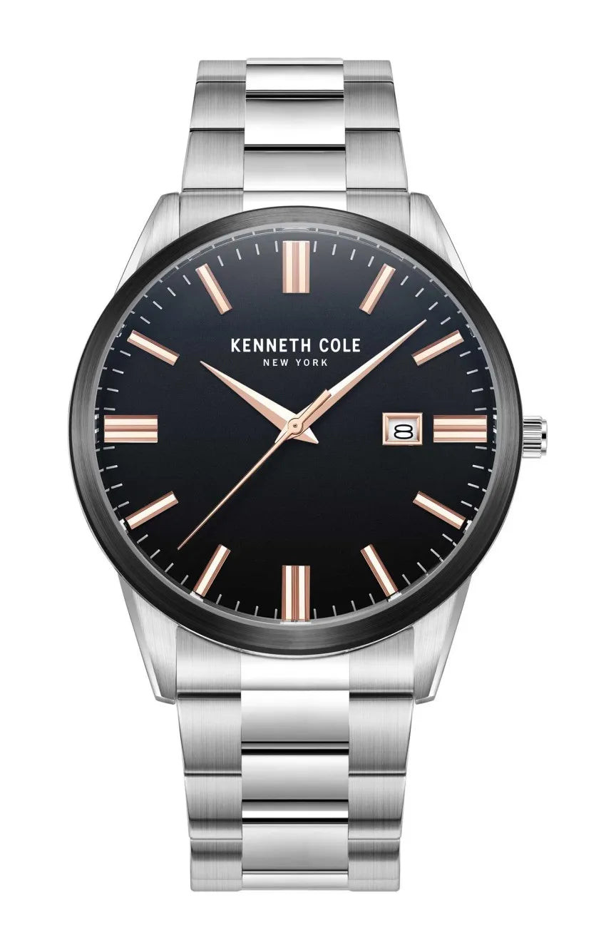 BRT is a Kenneth Cole New York men’s two‑tone watch featuring a silver and