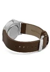 polished stainless steel case, black dial, and brown leather strap. Designed