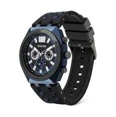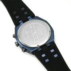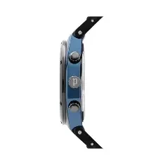 stainless steel case, vibrant blue dial, and a sporty black silicon strap. It