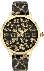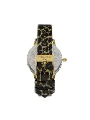LEATHER is a women's analog watch with a gold-plated case, striking black dial,