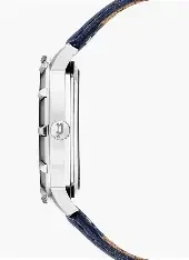 silver case, blue dial, and blue leather strap—fashion-forward yet versatile,
