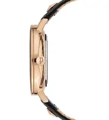 rose gold-plated case, black patterned dial, and black leather strap—combining