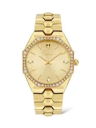 wearability in a 35–36 mm gold-plated stainless steel case. Its minimalist gold