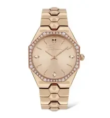 RG BRACELET features a chic 35–36 mm rose gold-plated stainless steel case, a