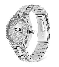 measuring around 35 mm and a sleek silver dial that complements the matching