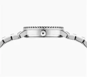 with white mother-of-pearl dial and silver bracelet—delivers sophisticated