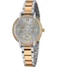 silver case, silver dial, and two-tone stainless steel/gold-plated