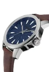 BLUE DIAL, BROWN STRAP is a men’s wristwatch featuring a polished stainless