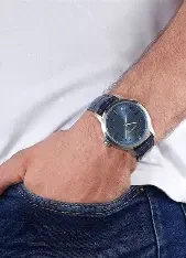 steel case, deep navy blue dial, and comfortable blue strap. Designed for men