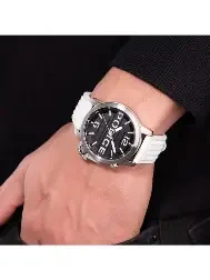 steel case, bold black dial, and modern white genuine leather strap. Designed