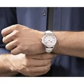 STEEL CASE, LASER CRY, WHITE DIAL, WHITE LEATHER is a men’s analog watch
