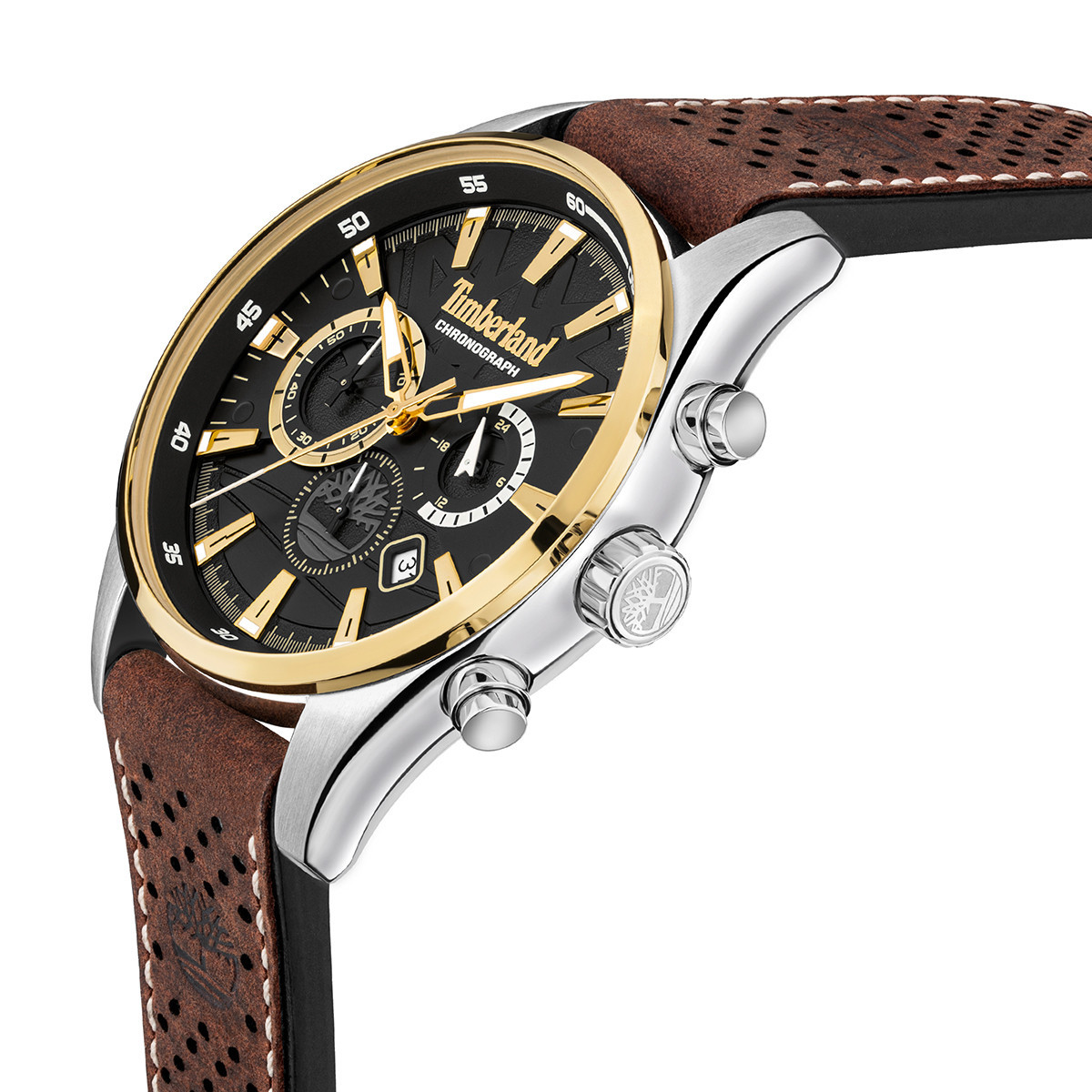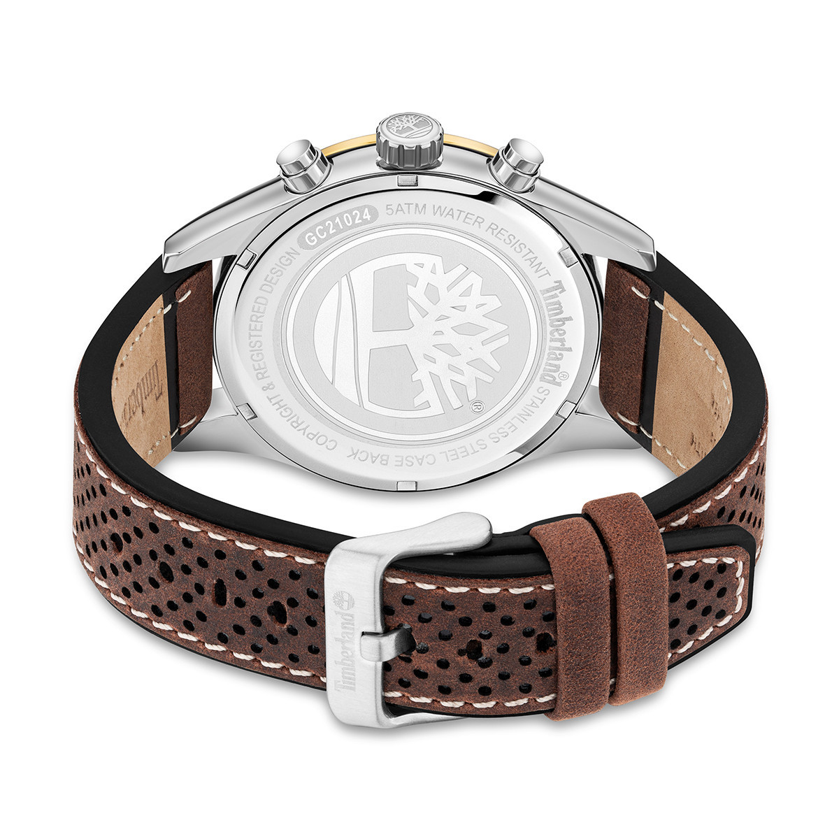 Timberland Aldridge TDWGC2102402 balances classic style with practical chronograph functionality. The 46 mm stainless steel case houses a black dial with chronograph subdials, a date window, and luminous hands, designed for clear readability. The black ion-plated bezel adds rugged contrast, while the brown Better Leather strap certified by the Leather Working Group ensures sustainability and comfort. This watch features an accurate quartz chronograph movement and is protected by mineral glass. With 5 ATM water resistance, it handles everyday moisture and splashes, making it a versatile accessory for casual and formal occasions.