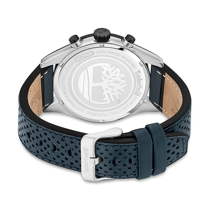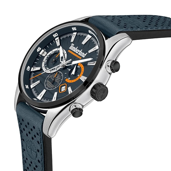 The Timberland Aldridge TDWGC2102403 combines rugged sophistication with dependable functionality. The 46 mm black ion-plated stainless steel case houses a navy chronograph dial with subdials for stopwatch functions and a date window, all protected by durable mineral glass. The navy Better Leather strap, certified by the Leather Working Group (LWG), ensures sustainable sourcing and comfortable wear. Powered by a precise quartz chronograph movement and offering 5 ATM water resistance, this watch suits a versatile lifestyle from the office to outdoor adventures.