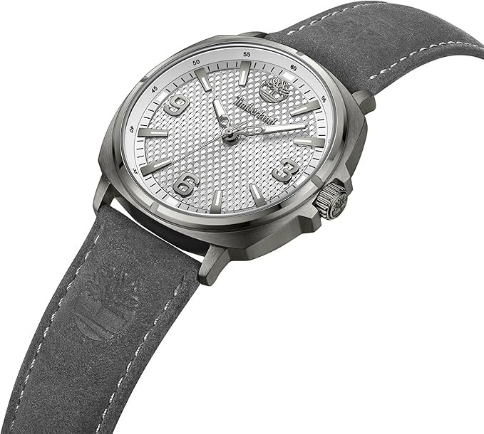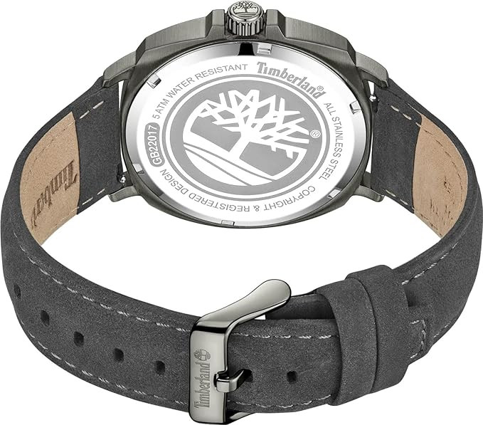 The Timberland Bailard TDWGB2201703 is designed for the active modern man seeking functional style. This watch features a 44 mm stainless steel case with an ion-plated gunmetal finish, complemented by a cool gray dial. The analog display offers three hands powered by accurate quartz movement, all shielded by durable mineral glass. Paired with a gray Better Leather strap certified by the Leather Working Group, it combines sustainability with comfort. Water resistant to 5 ATM, it withstands splashes and brief moisture exposure, perfect for everyday wear.