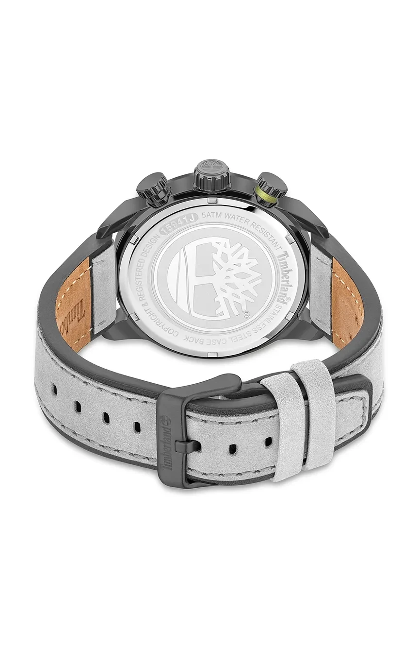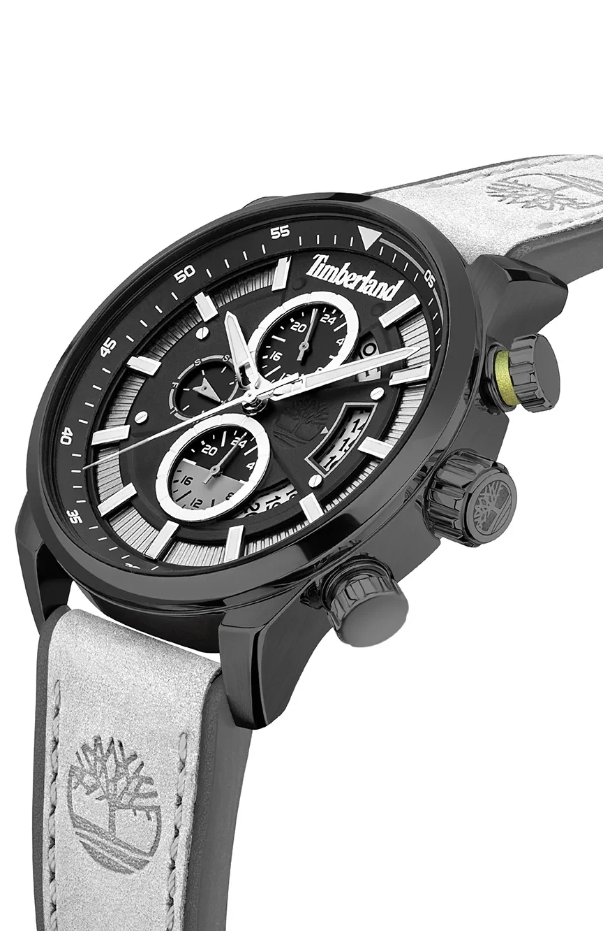 The Timberland Callahan TDWGF2102601 is a multifunctional watch that combines rugged style with eco-conscious materials. The 46 mm black ion-plated stainless steel case frames a sleek black dial featuring sub-dials for multifunctional timekeeping including day, date, and 24-hour indicators. The grey Better Leather strap, certified by LWG, ensures sustainability and comfort. Mineral glass protects the dial from scratches, while the accurate quartz movement keeps precise time. Water resistance up to 5 ATM enables the watch to withstand daily moisture and splashes, making it ideal for casual and active lifestyles.