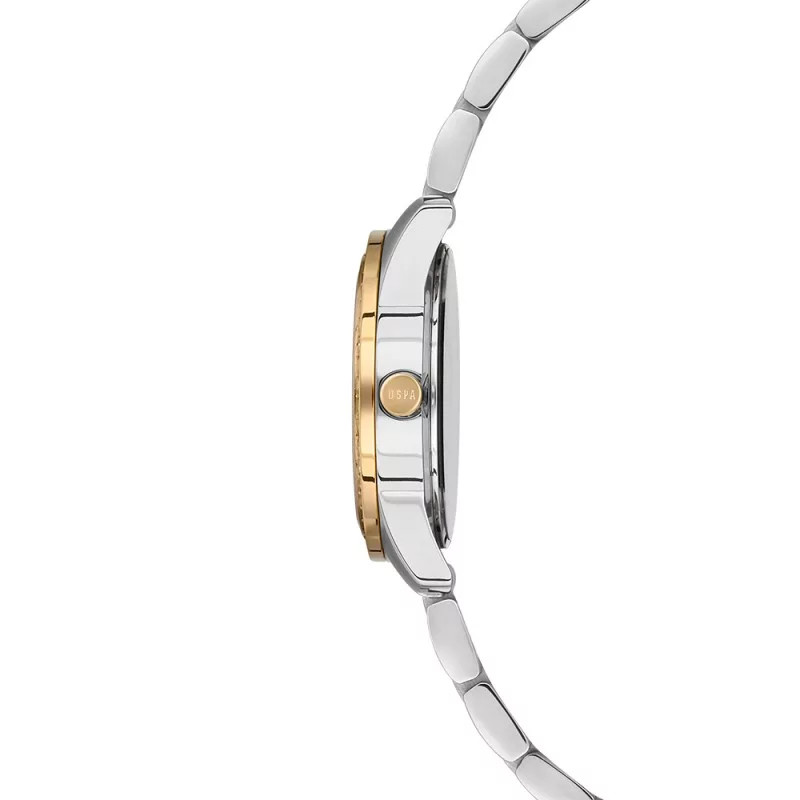 This ladies quartz watch from U.S. POLO ASSN. features a sleek 28mm stainless steel case paired with a durable metal bracelet, delivering a timeless and versatile design. The analog dial is protected by mineral glass, offering good scratch resistance. Powered by a reliable quartz movement, the watch ensures accurate timekeeping suitable for casual and office wear. With a water resistance rating of 3 ATM (30 meters), it withstands splashes and brief contact with water. The metal band is secured with a fold-over clasp for comfortable, secure wear. This compact timepiece balances style and practicality, making it an excellent accessory for everyday use.