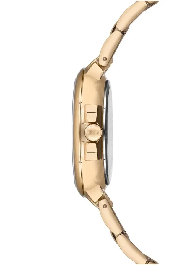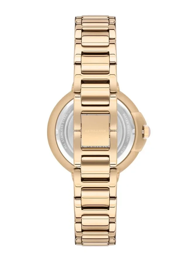 The U.S. Polo Assn. Stile ladies analog watch combines sophistication and durability in one beautifully crafted timepiece. It features a 35mm round gold-tone stainless steel case complemented by a matching gold-tone metal bracelet with a secure fold-over clasp. The clear analog dial is protected by scratch-resistant mineral glass, displaying simple hour markers and precise quartz movement to ensure accurate timekeeping. Suitable for everyday wear or special occasions, the watch also offers water resistance, protecting against splashes and accidental moisture. This watch exudes classic style with contemporary flair, making it a versatile addition to any wardrobe.
