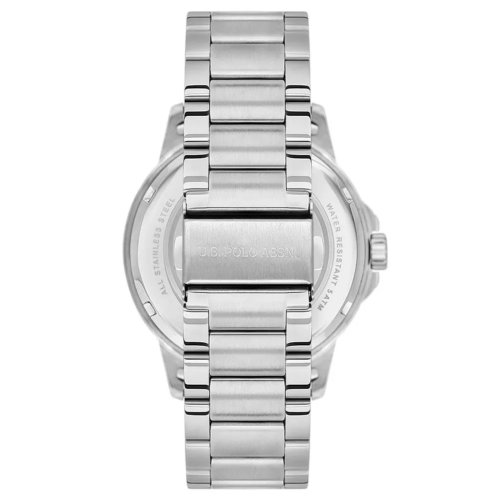 The USPA1000B-05 from U.S. Polo Assn. delivers modern quality with a bold design. The watch includes a sturdy 44 mm metallic gray stainless steel case and bracelet, paired with a green analog dial for a dynamic look. Its mineral glass cover offers reliable scratch resistance. Powered by accurate quartz movement, it features water resistance up to 5 ATM, ensuring protection against splashes and brief immersion. With a practical calendar function, this watch suits sporty, business, and casual occasions.