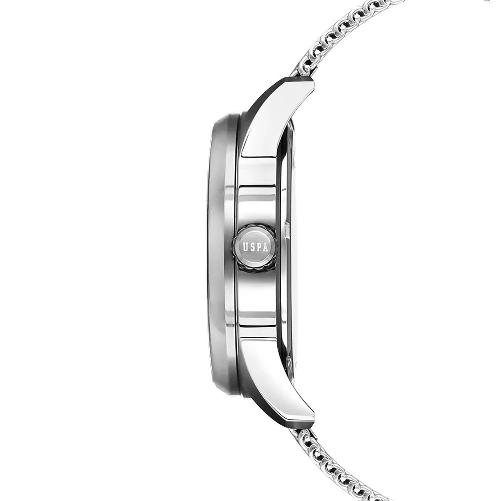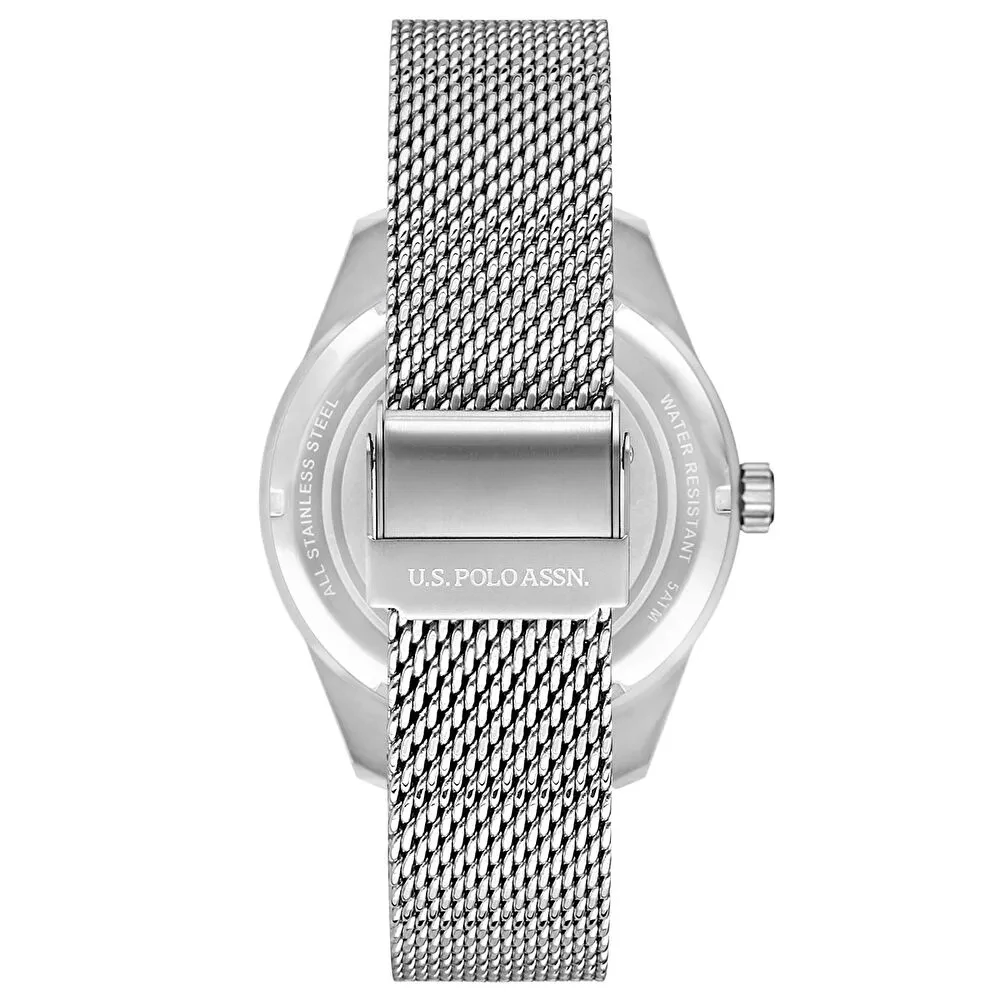 The USPA1001-07 from U.S. Polo Assn. combines sporty design with durable construction. This watch features a 43 mm round metallic gray stainless steel case paired with a comfortable mesh silicone strap in matching color. The green analog dial is clear and easy to read, protected by scratch-resistant mineral glass. Powered by precise quartz movement, it includes a calendar function and offers water resistance up to 5 ATM, providing protection against splashes and brief immersion. This versatile watch is suitable for casual and active use alike.