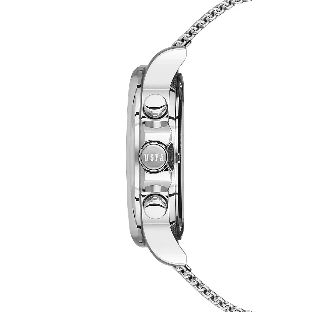 The USPA1020-05 from U.S. Polo Assn. exemplifies sport meets sophistication in a durable timepiece designed for men. This watch has a 45 mm round stainless steel case finished in metallic gray and a sleek matching mesh band. The green analog dial is clear and easy to read, shielded by scratch-resistant mineral glass. Powered by a precise quartz movement, it includes a calendar and is rated for 5 ATM water resistance, protecting against splashes and brief immersion in water. With its sport-inspired style and robust construction, this watch is suited for casual and active wear.