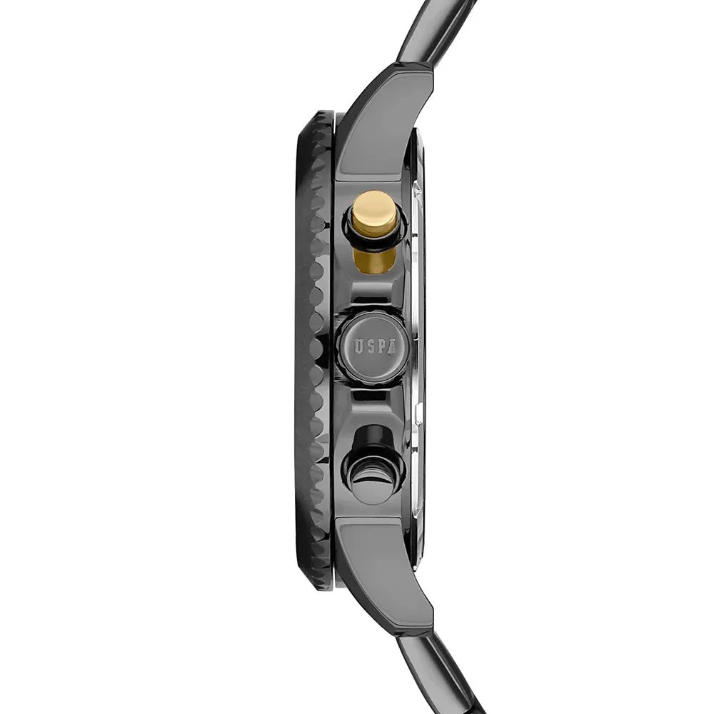 The USPA1034-06 from U.S. Polo Assn. offers a bold presence with its 46 mm round case in smoky metallic gray and a coordinated stainless steel bracelet. The analog blue dial is protected by scratch-resistant mineral glass and features luminous accents for visibility. Powered by precision quartz movement, this sport watch boasts 5 ATM water resistance, making it suitable for daily wear and resistant to splashes. The calendar function adds practicality, while the robust steel band ensures security and comfort. Its modern, sporty appearance complements both casual and active lifestyles.