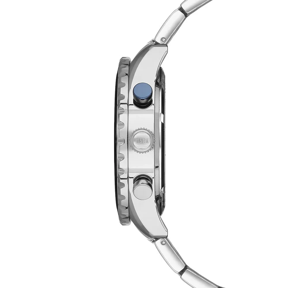 The USPA1037-01 from U.S. Polo Assn. is designed for men who appreciate a classic yet sporty timepiece. It features a round 44 mm stainless steel case finished in metallic gray, matched with a comfortable and polished steel band. The black dial has luminous hands and markers, ensuring excellent readability under various lighting conditions. Powered by a precise quartz movement, the watch includes a calendar function for practical daily use. The dial is protected by mineral glass that resists scratches, while 5 ATM water resistance secures the watch from water splashes and rain. This watch offers versatility, making it a perfect accessory for any occasion.
